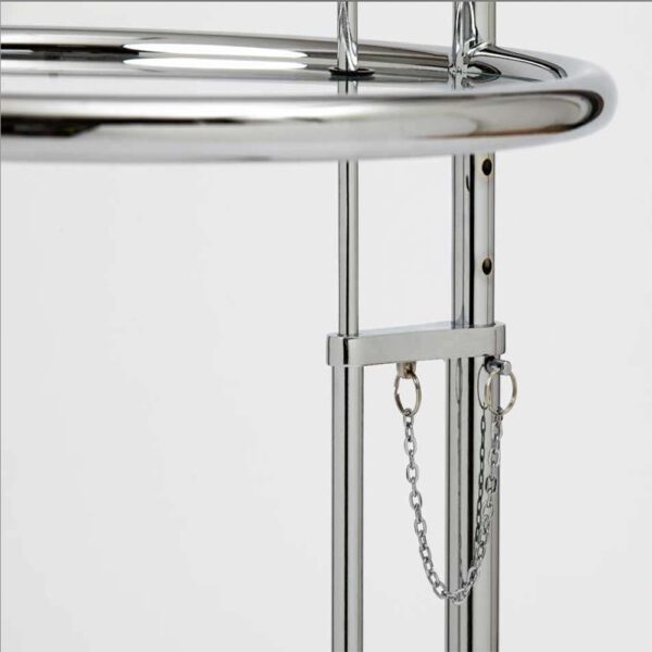 Oltre alla sua funzionalità regolabile, il tavolino è anche un’opera d’arte in sé. La combinazione di acciaio cromato lucido e vetro trasparente crea un contrasto visivo affascinante e riflette la luce in modo elegante, aggiungendo un tocco di raffinatezza e luminosità a qualsiasi ambiente. La sua estetica moderna e sofisticata si sposa bene con una varietà di stili d’arredamento, dal minimalismo al design più eclettico.